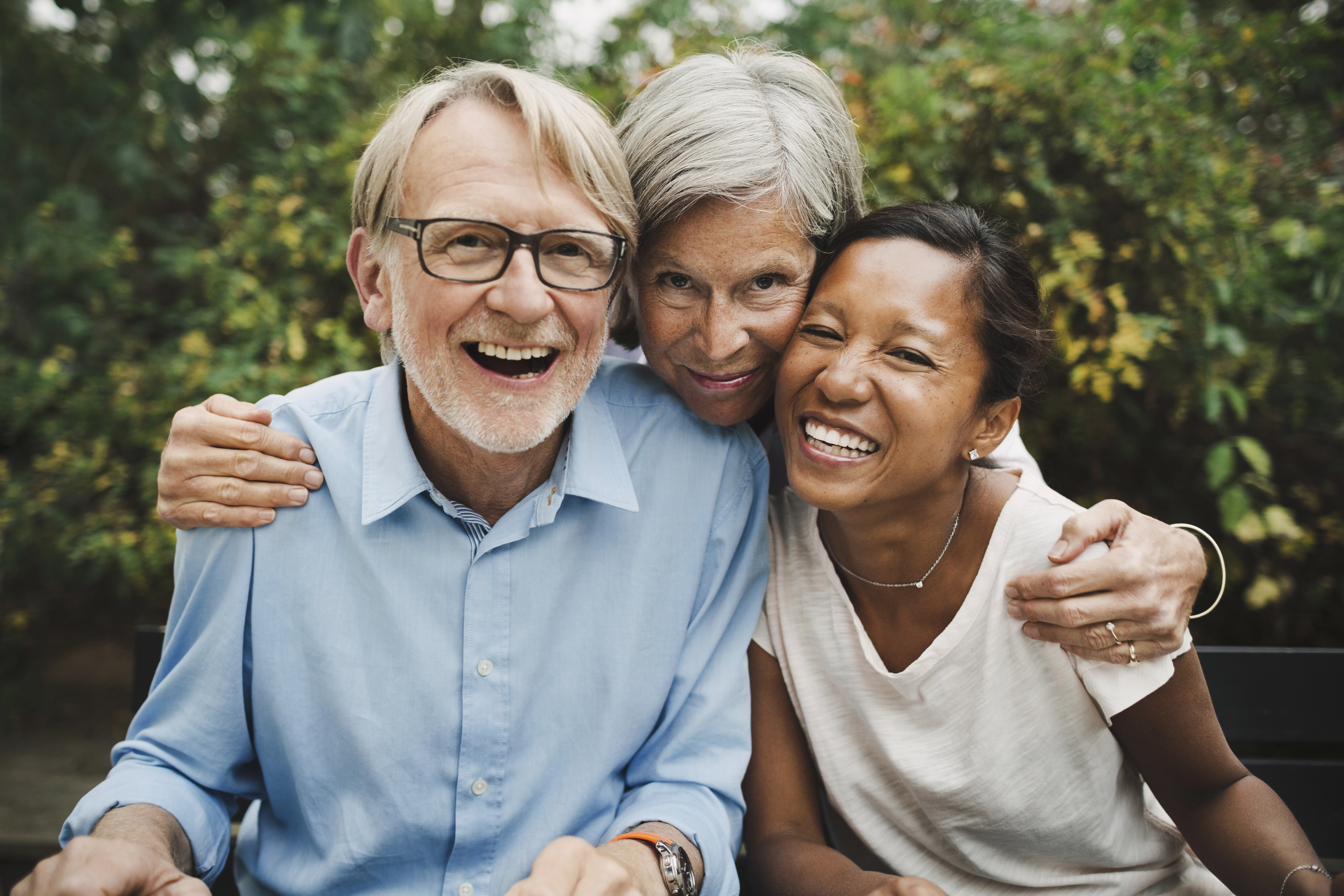 Äldre kvinna håller armarna om en man och en kvinna, alla ler och tittar in i kameran
