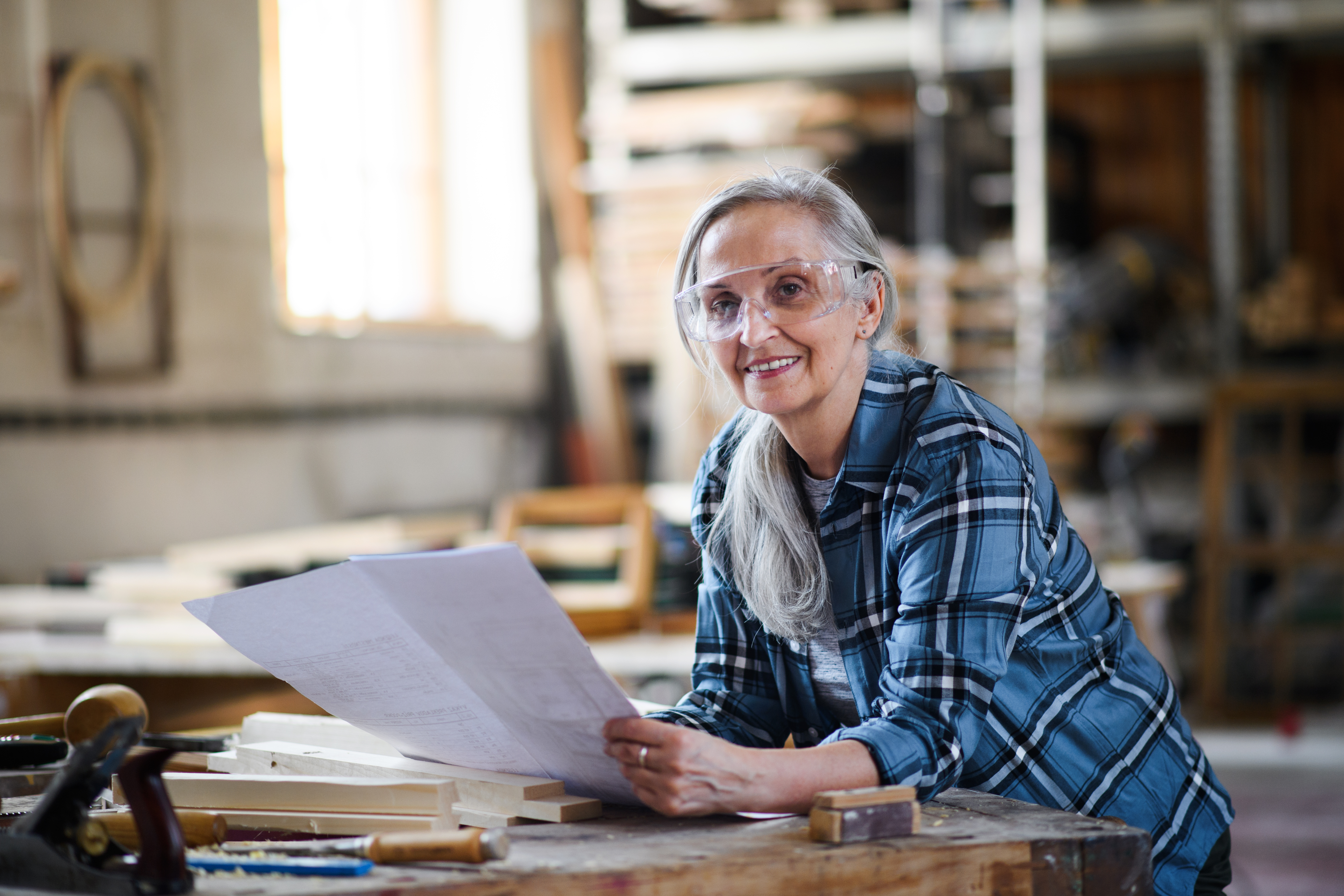 En kvinnlig snickare står vid en arbetsbänk, ler mot kameran