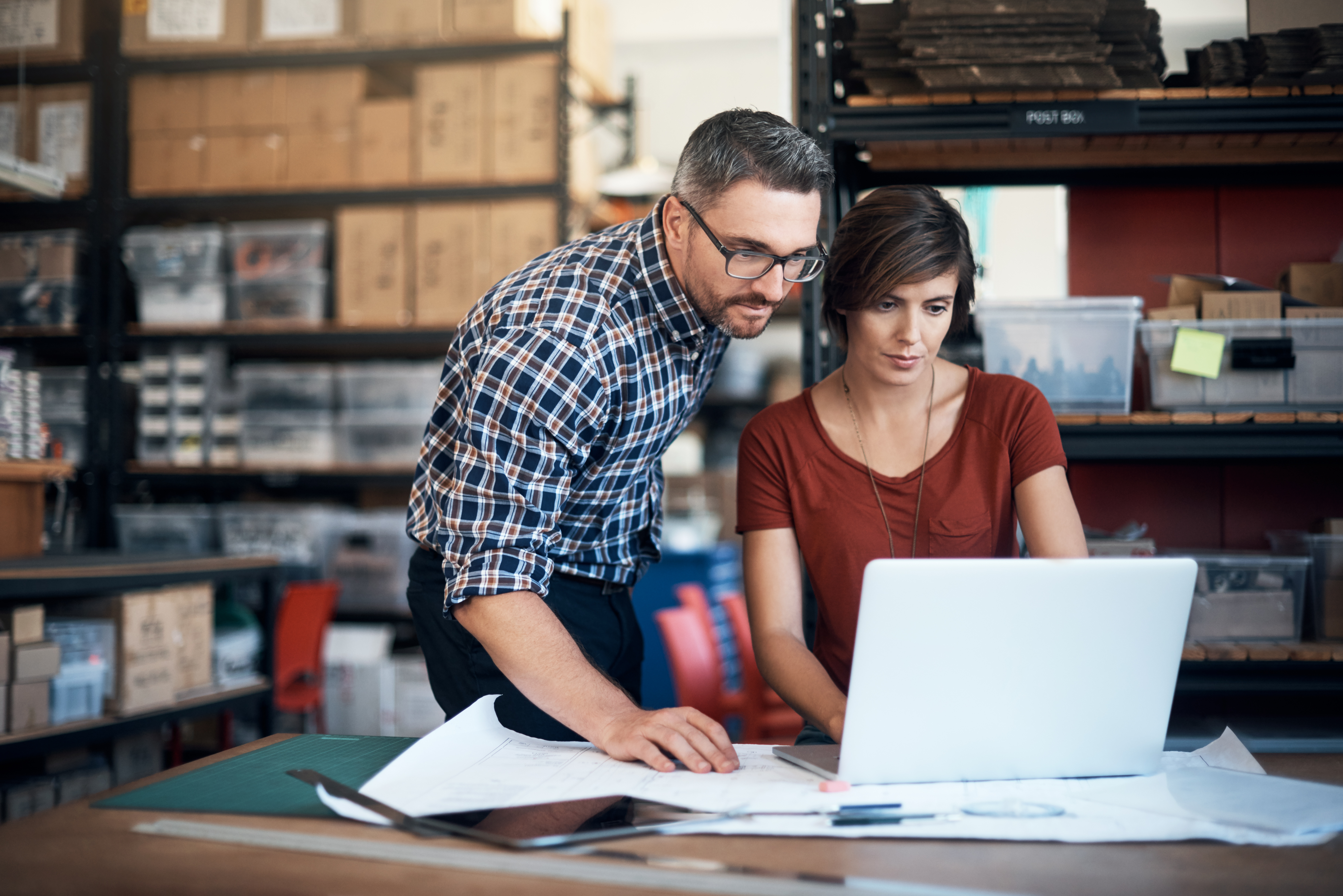 Man och kvinna står tillsammans vid en arbetsbänk och tittar på en bärbar dator