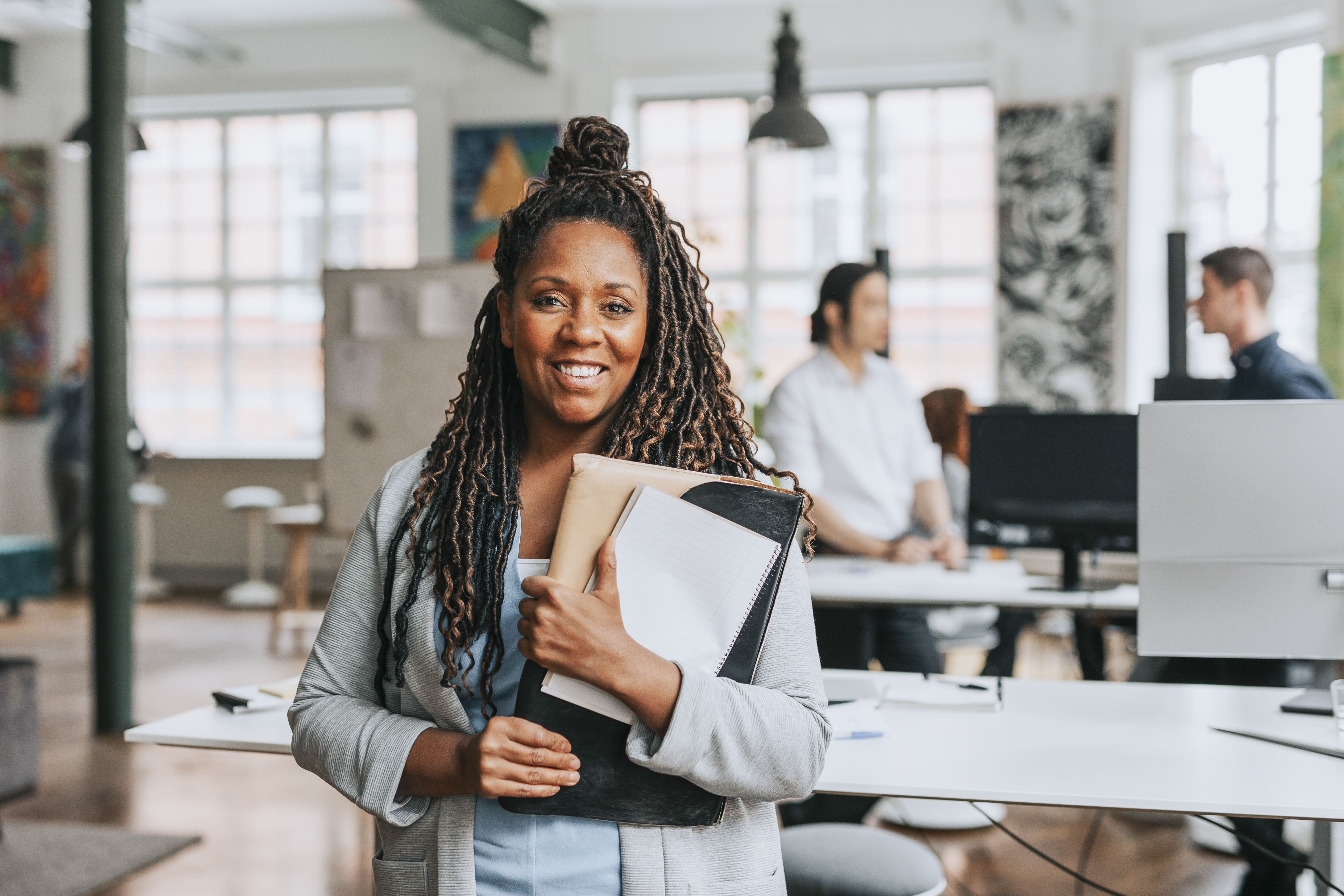 En kvinna på kontoret, med en mapp i famnen, ler mot kameran.