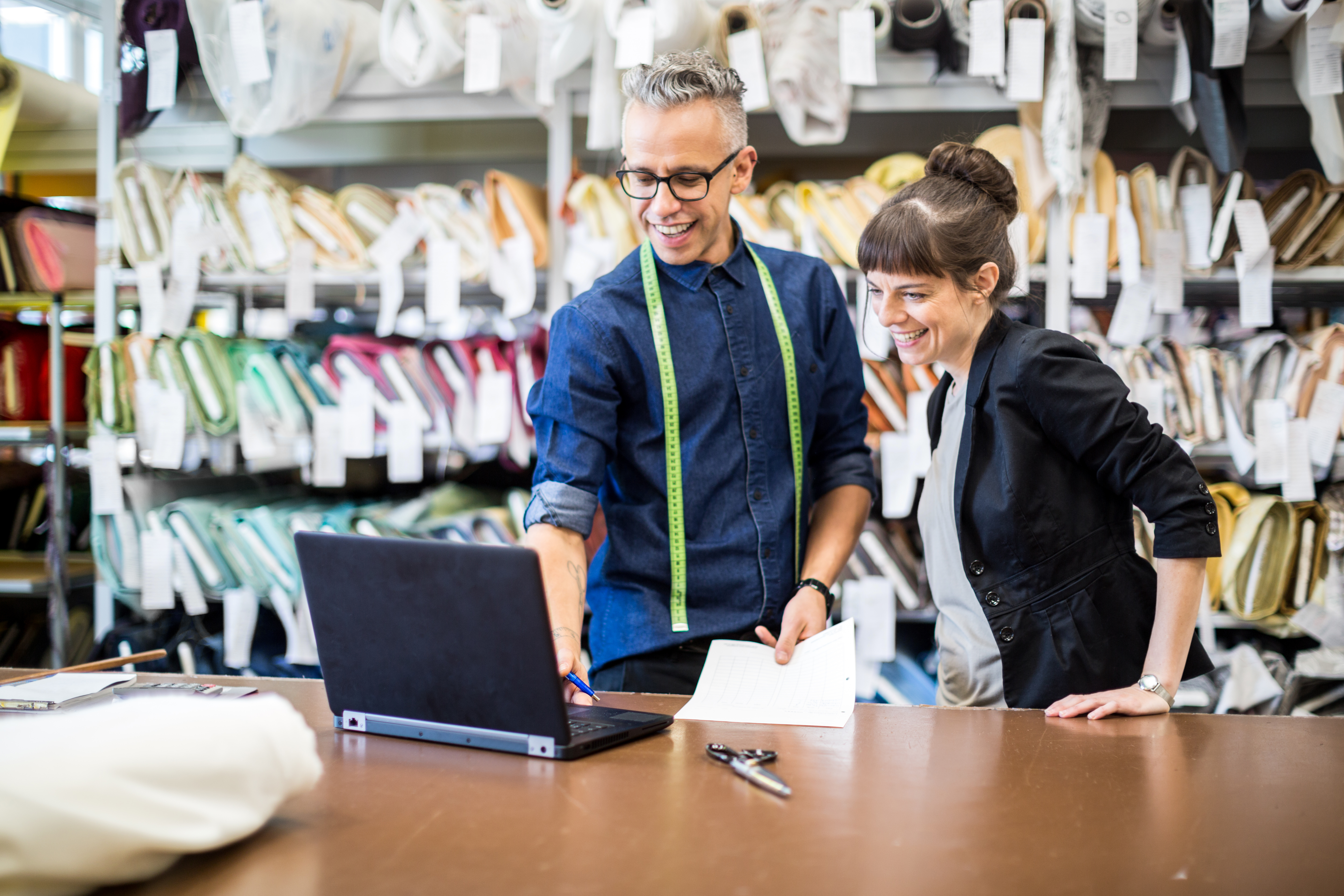 Man och kvinna står tillsammans vid en arbetsbänk och tittar på en bärbar dator